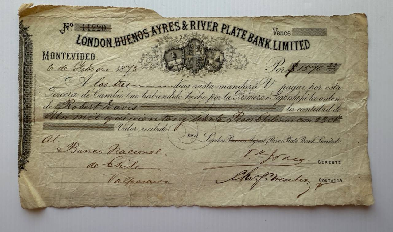 19th-century bill of exchange issued in Montevideo and payable in Valparaiso. Early London-Buenos Ayres-Chile banking network. Historic example of British-Latin American banking expansion.