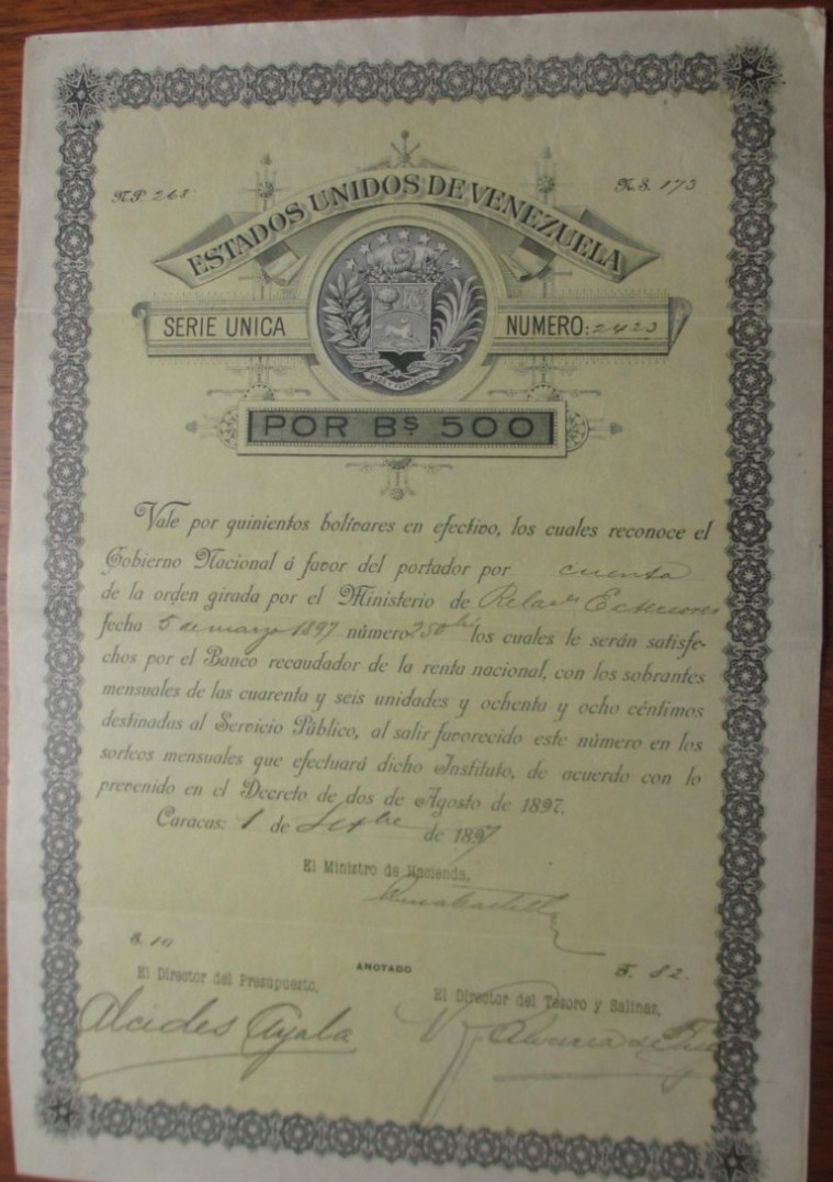 Treasury voucher (Vale del Tesoro) for 500 Bolívares issued by the Ministry of Finance of the United States of Venezuela in Caracas, dated 1 September 1897. Printed in olive-green and black with the national coat of arms and signatures of Alcides Ayala and other officials. Represents government recognition of debt payable through the National Revenue Office, linked to public service funds. A rare and historically valuable document.