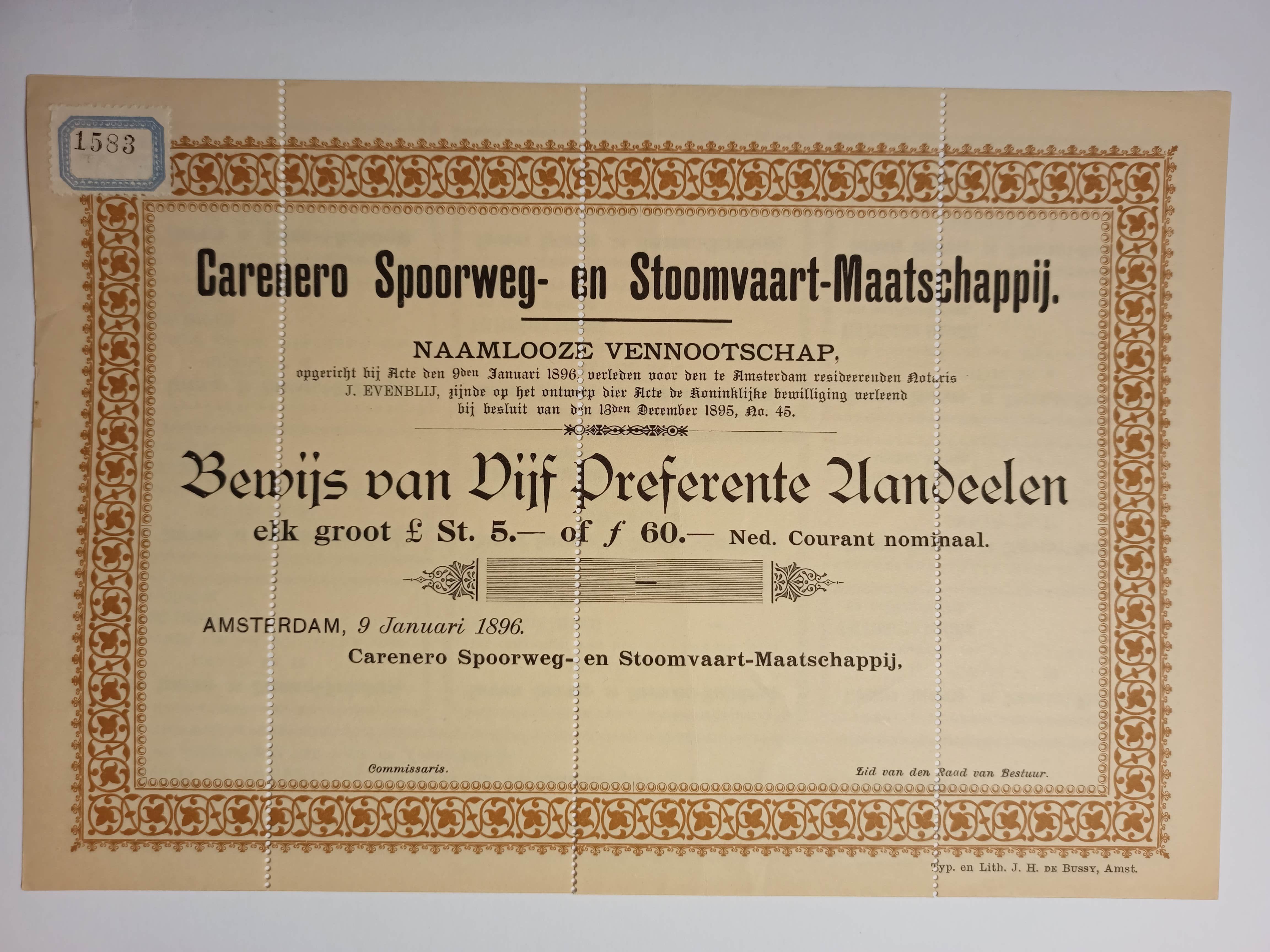 Smaller denomination certificate for 5 preferred shares (total £15 nominal) from the Carenero Railway and Steamship Company, Amsterdam, dated 1896. Printed in brown with elegant frame. Ideal budget entry for Dutch rail and maritime scripophily.