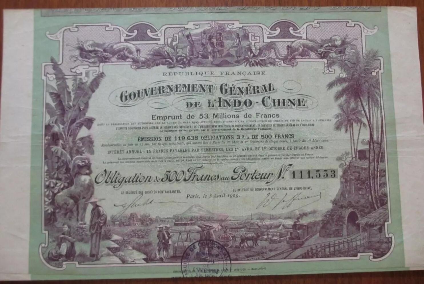 Vietnam French Indochina Colonial General Government Bond Loan 1909 500 Francs