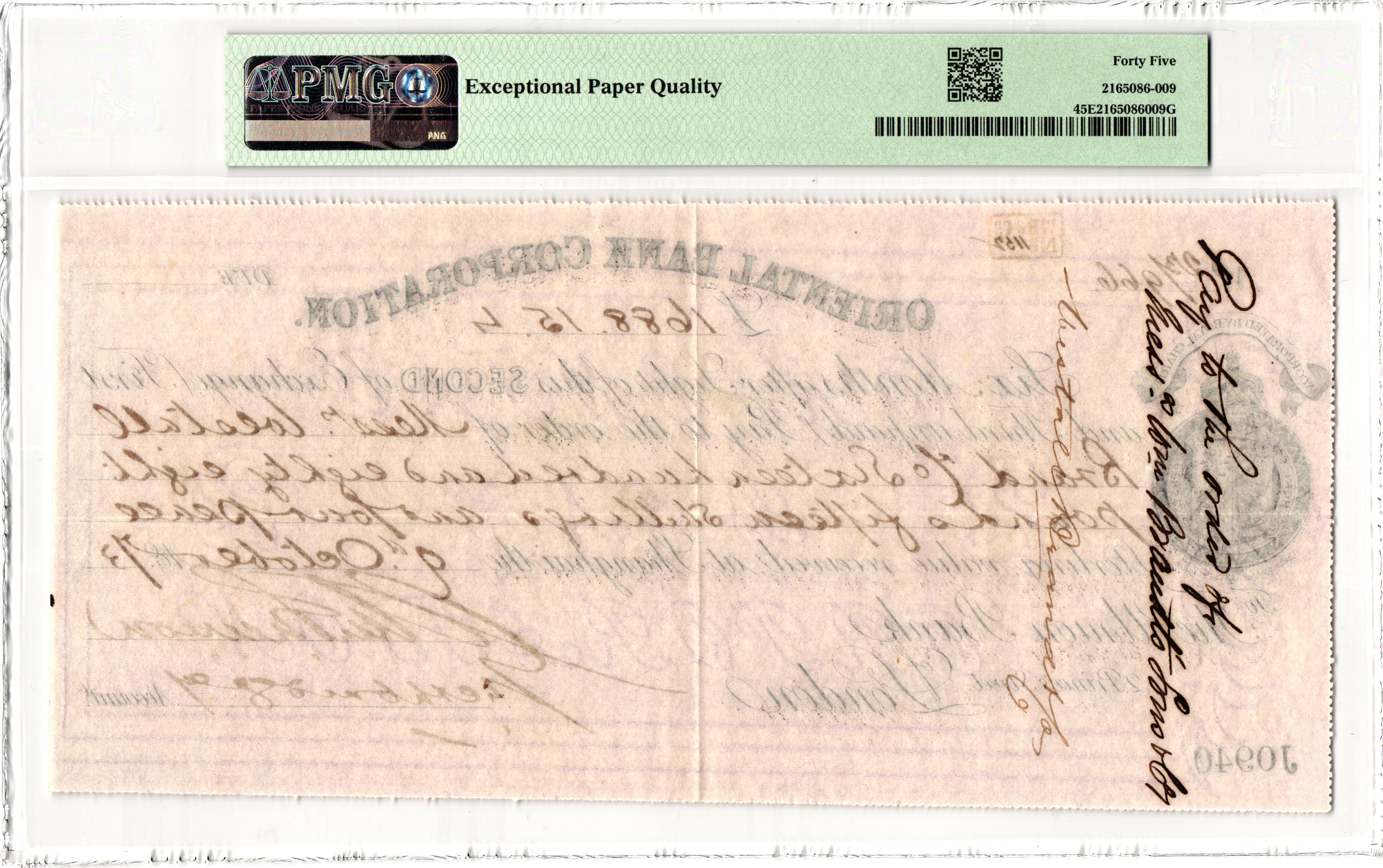 # S/N 23/966 The Oriental Bank Corporation (Chinese: 東藩滙理銀行), or “OBC”, was a British imperial bank founded in India which grew to be prominent throughout the Far East. As an Exchange bank, the OBC was primarily concerned with the finance of trade and exchanges of different currencies. It was the first bank in Hong Kong and the first bank to issue banknotes in Hong Kong. 250
