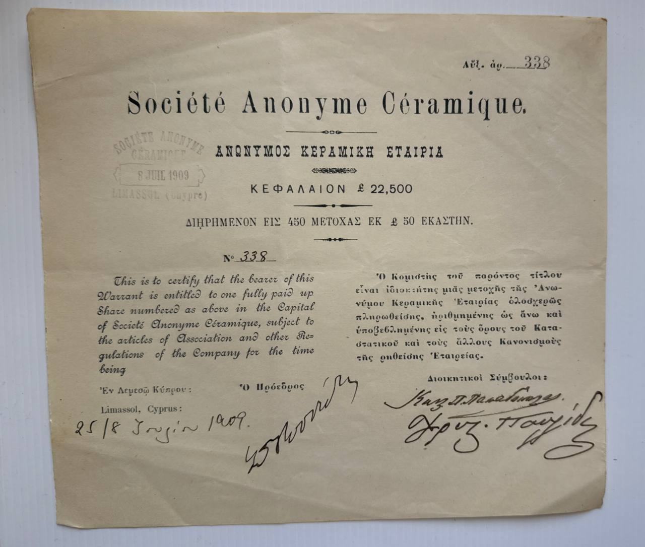 Later issue from the same ceramic company in Cyprus. Dated 1909, bilingual Greek-English-French certificate. Rare financial document from colonial-era Cyprus, endorsed by notable local businessmen.