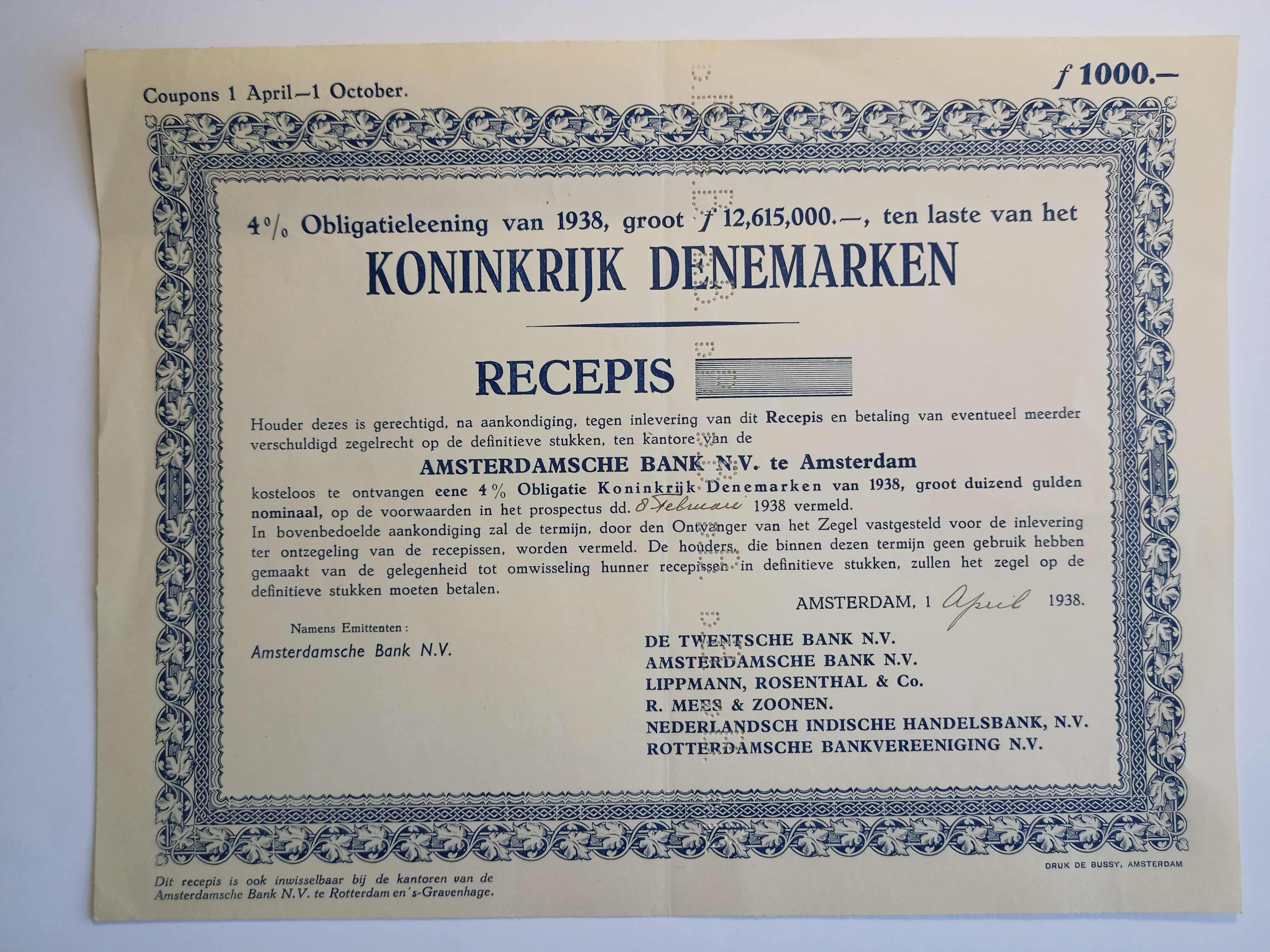 Receipt for 4% bond of the Kingdom of Denmark, issued April 1, 1938, in Amsterdam by Amsterdamsche Bank N.V. Printed in blue on cream paper with ornate border. Represents pre-war European sovereign debt placement in foreign markets. A scarce item for collectors of Scandinavian finance.