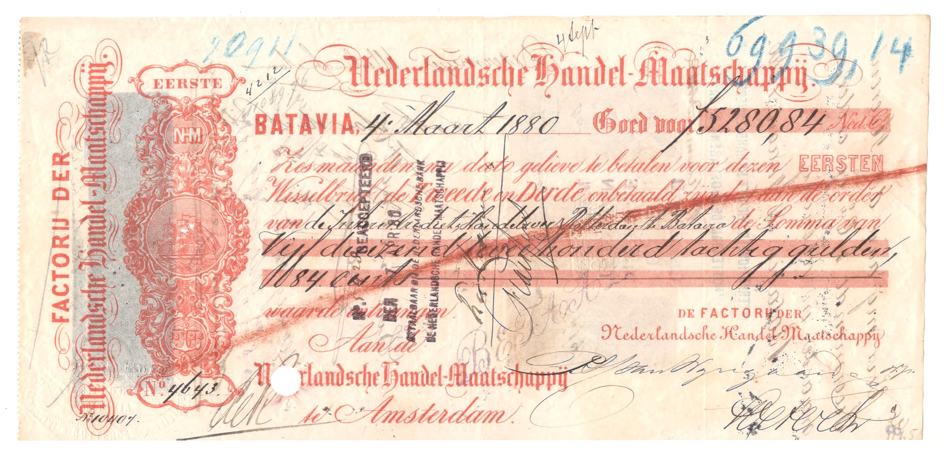 This rare 1880 bill of exchange, issued by the Nederlandsche Handel-Maatschappij (Netherlands Trading Society) in Batavia (modern-day Jakarta, Indonesia), is a significant artifact from the colonial trade era. Founded in 1824 by King Willem I of the Netherlands, the NHM was initially created to promote trade between the Netherlands and its colonies, particularly the Dutch East Indies. This bill represents a financial transaction tied to the vast global trading network facilitated by the NHM, one of the most influential trading and financial institutions of its time.