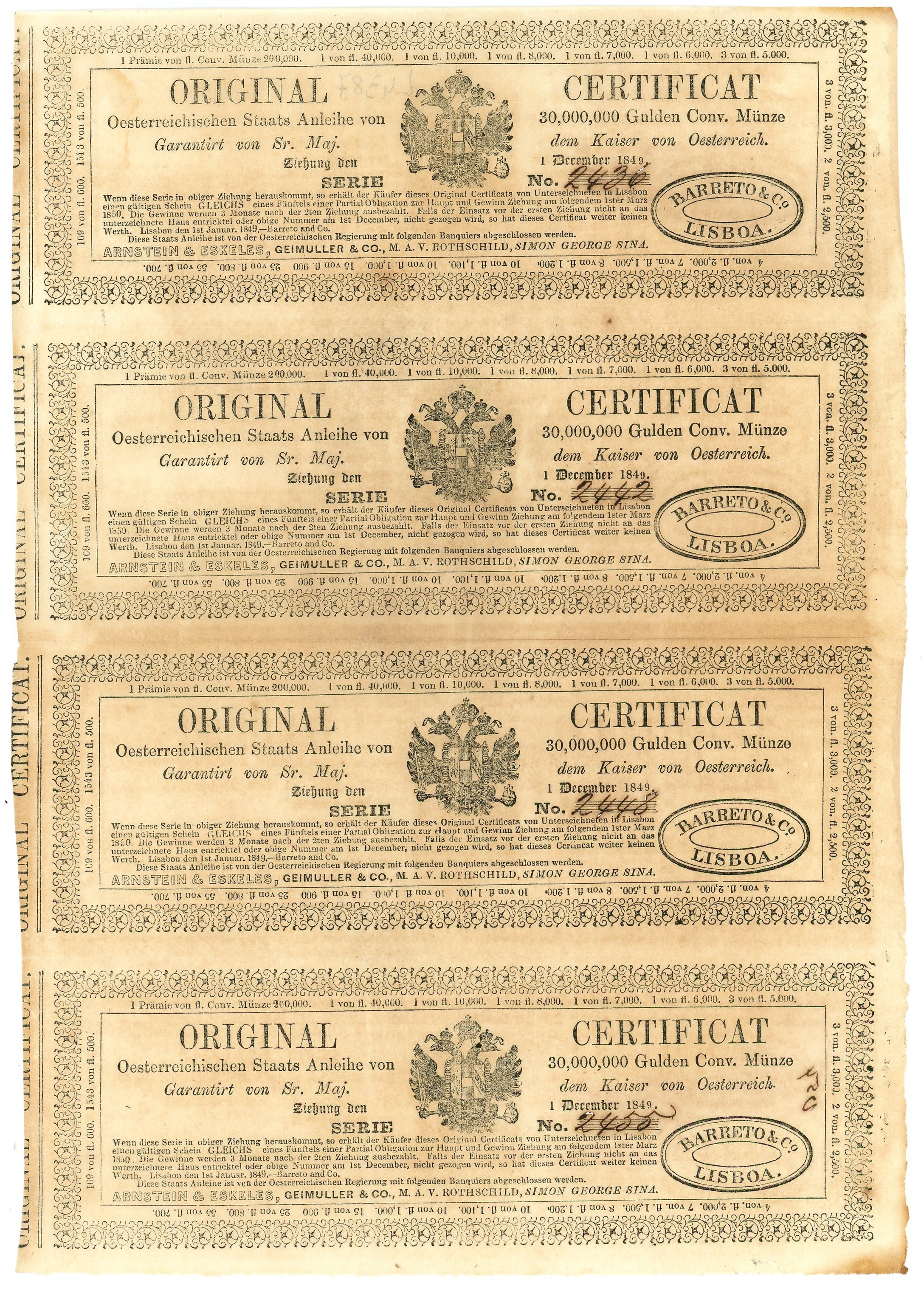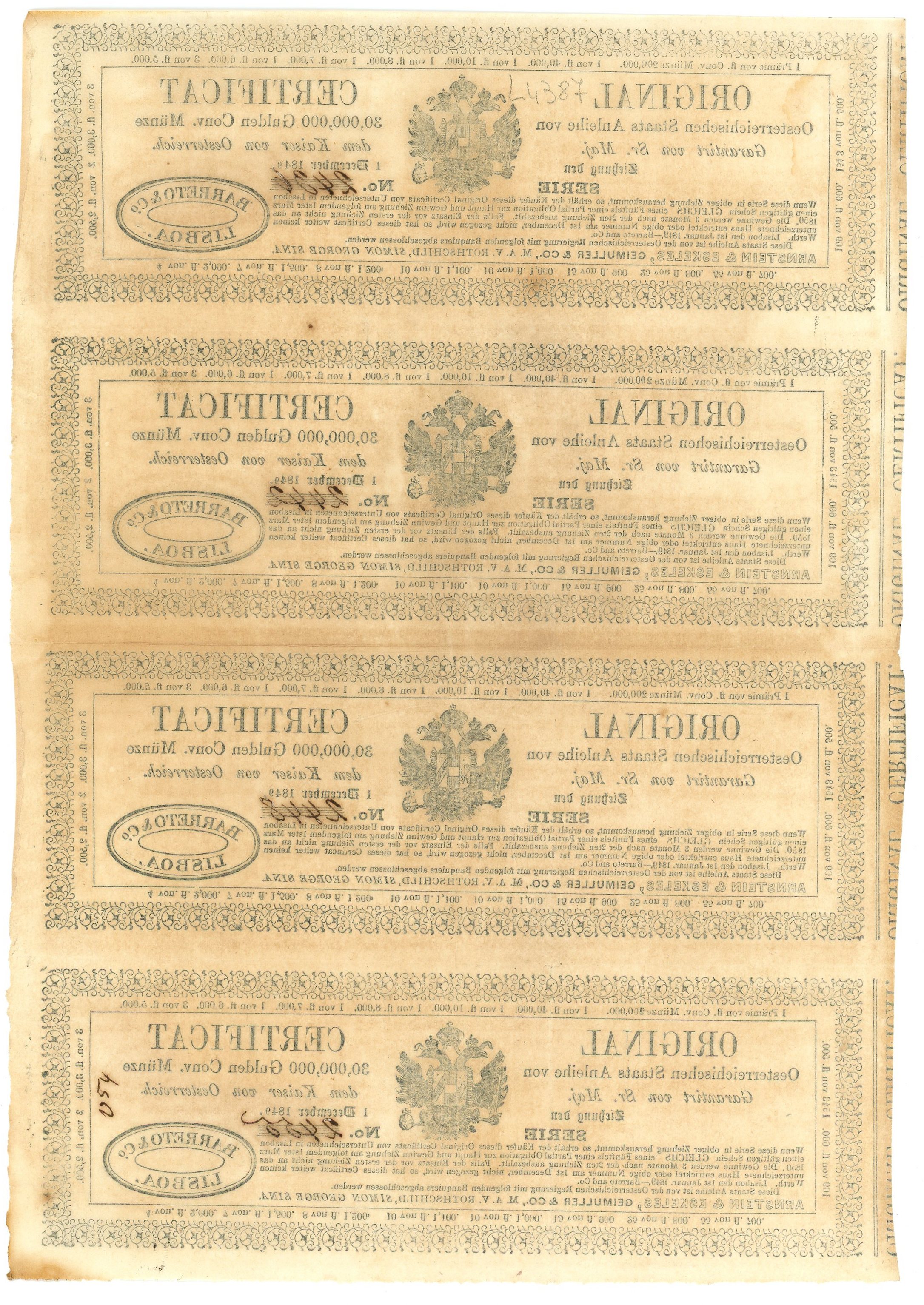 # 2436-2455 A very interesting financial construction: By purchasing this “Original Certificate”, the buyer secured the delivery of a partial bond in the event that their bonds, which bore the respective numbers, were drawn in the drawing on December 1, 1849. These certificates were used to protect against the draw and thus early repayment of high-yielding lottery bonds. XF