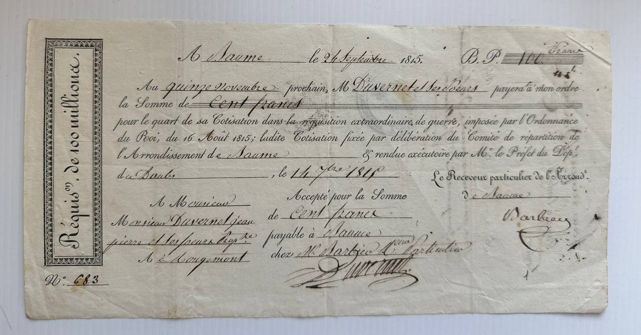 Historic French war-related document dated shortly after the fall of Napoleon, showing a tax obligation for 100 francs under the extraordinary war levy (‘Requis de 100 millions’). Scarce and appealing Revolutionary/Napoleonic era fiscal item.