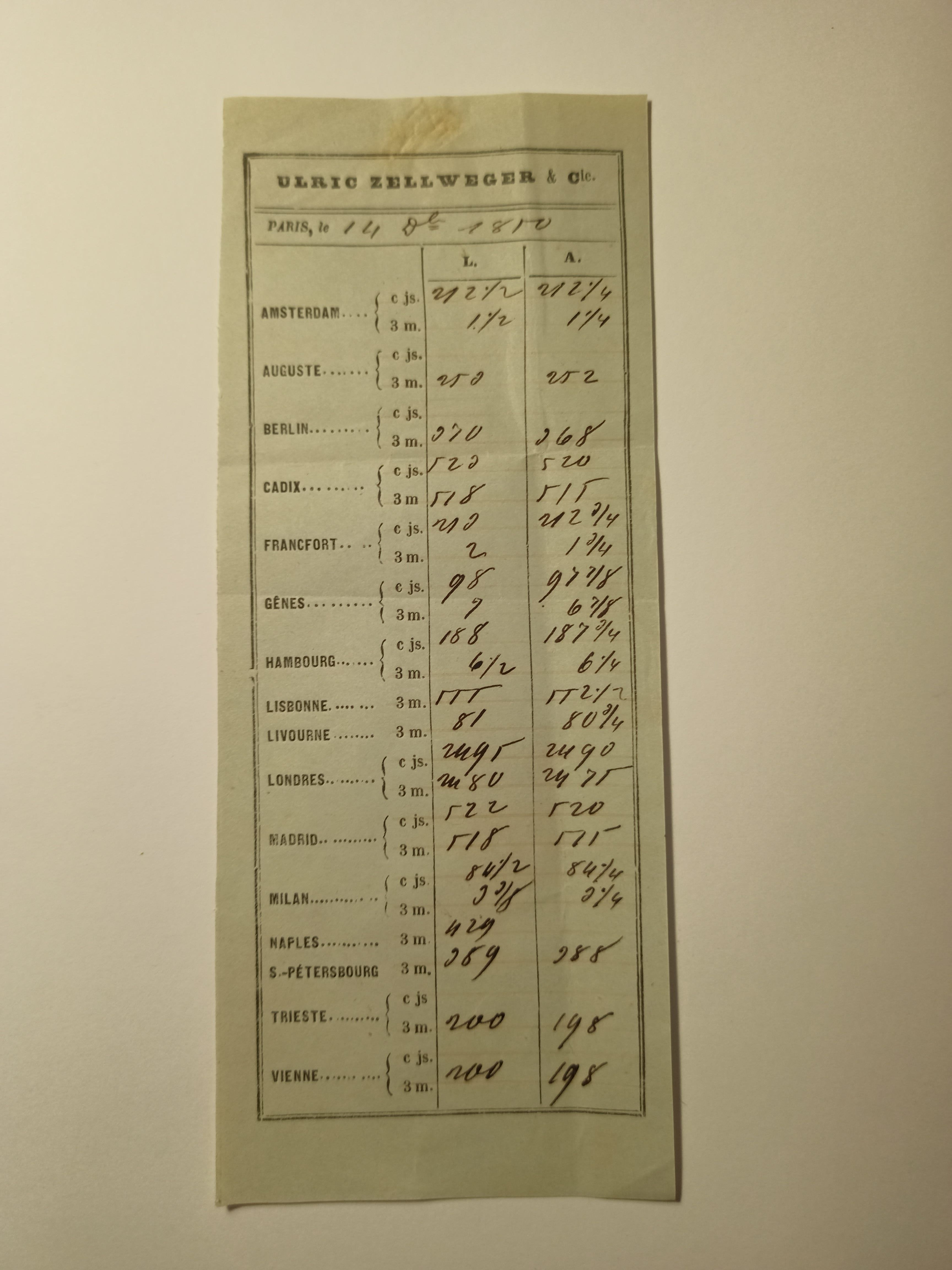 Ulric Zellweger & Cie was a prominent Swiss merchant and banking family from Trogen, Appenzell, deeply involved in international textile trade and finance during the 18th and 19th centuries. They were well connected to major European financial centers, and their financial records (such as this exchange rate sheet) are historically important in understanding cross-border commerce during the Franco-Prussian War period (1870).