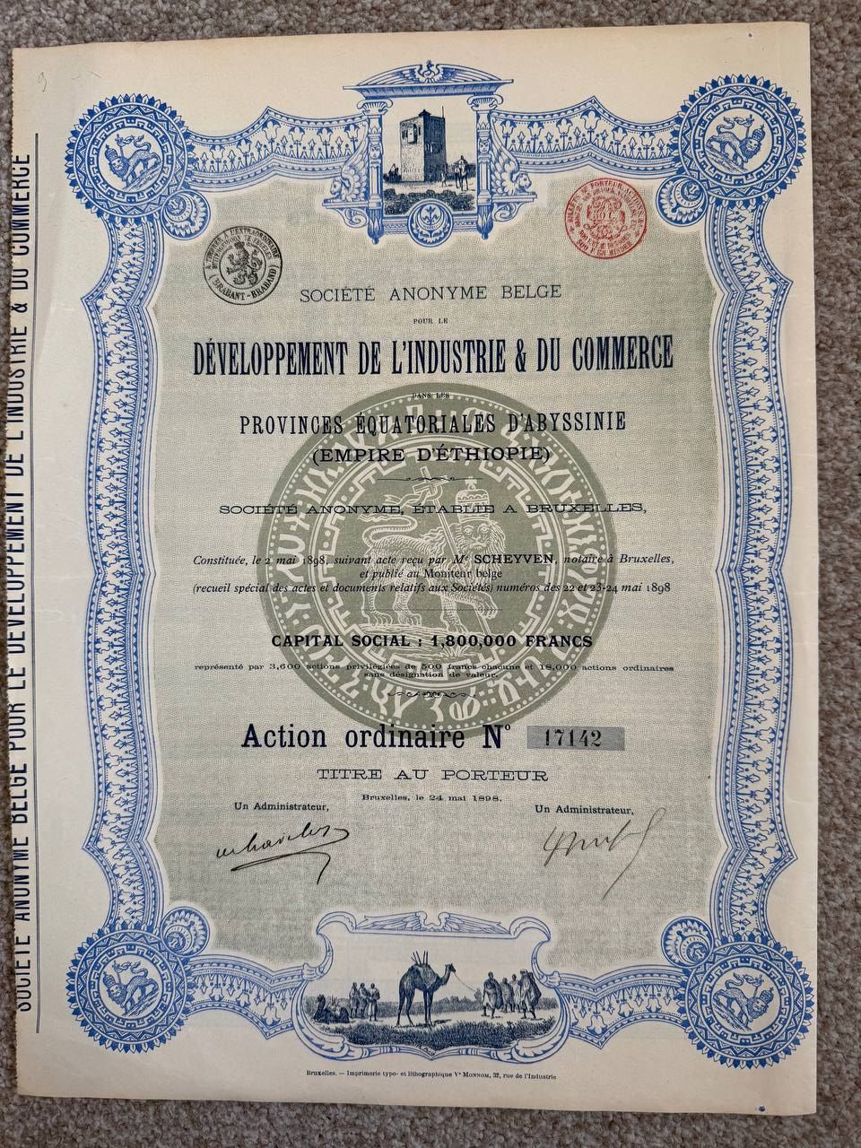 🏛 A stunning colonial-era financial document combining African, Belgian, and Middle Eastern design elements. Highly collectible for those interested in Ethiopian history, Belgian overseas commerce, or 20th-century African investment ventures.