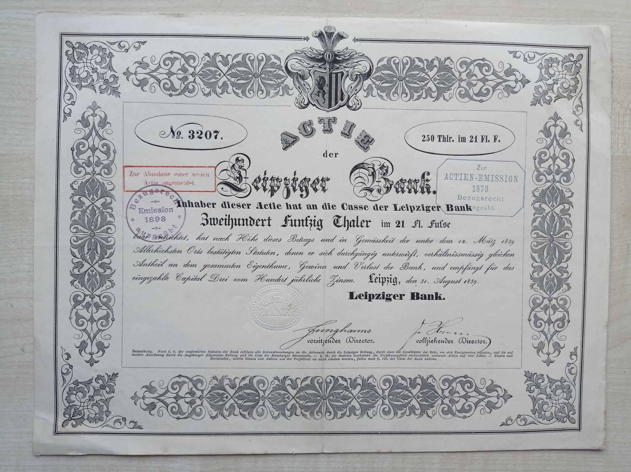 Historic early 19th-century share certificate from Leipziger Bank, Leipzig, dated 1839. Printed for 250 Thaler with Gothic styling and embossed seal. Later annotations reference exchange for a newer issue. One of the oldest German private banking shares.
