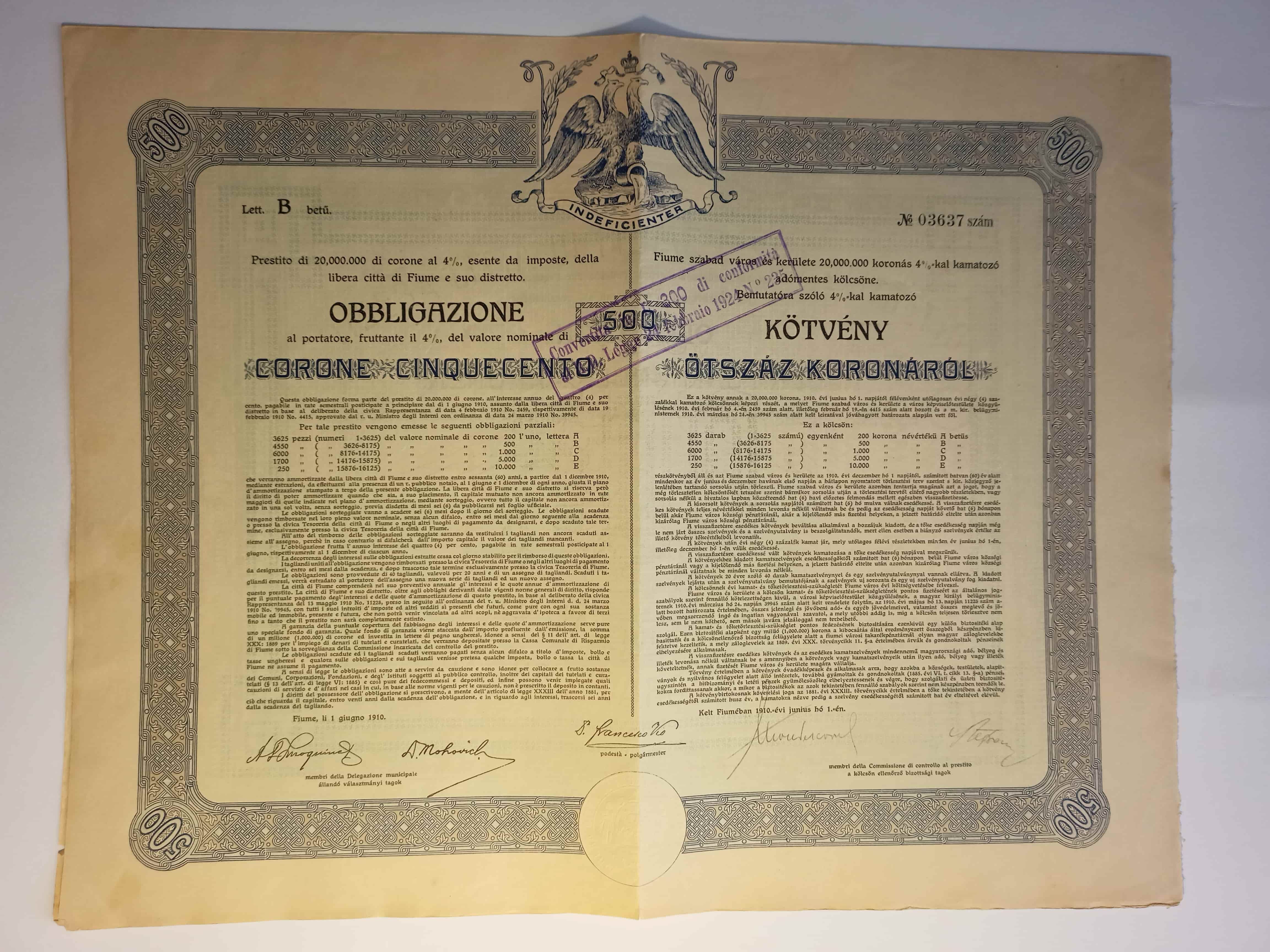 Municipal bond of 500 Kronen issued by the City of Fiume (today Rijeka, Croatia) in 1910. Text in Italian and Hungarian with city arms, symbolizing Fiume’s special autonomous status within the Austro-Hungarian Empire. A fascinating multinational collectible.