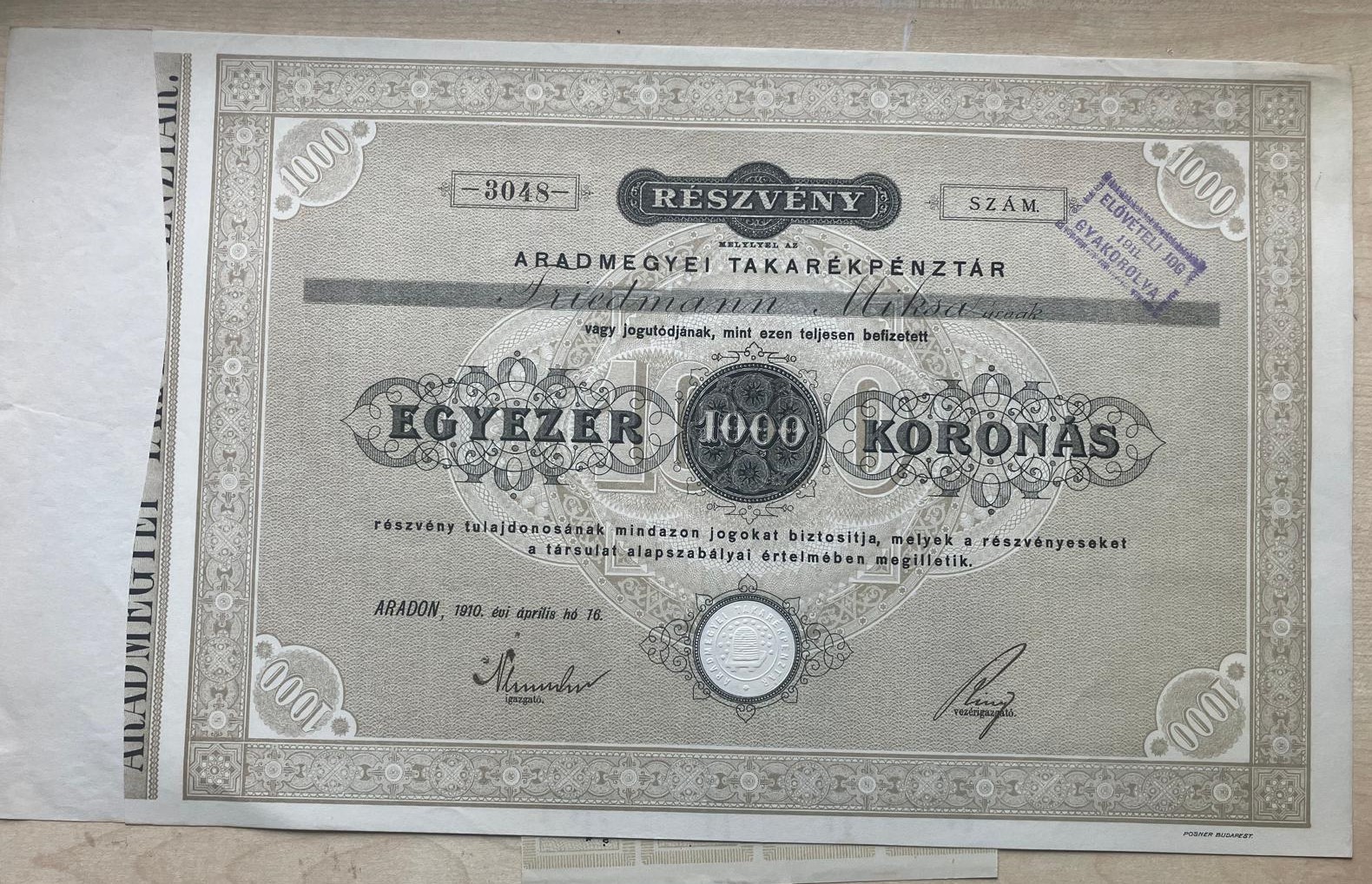 Issued by Aradmegyei Takarékpénztár (Arad County Savings Bank), April 1910, for 1000 Korona. A refined monochrome design by Posner, Budapest, with detailed ornamentation and embossed company seal. Represents financial stability and growth of local cooperative banks prior to WWI. An excellent collectible for those focusing on Austro-Hungarian economic history.