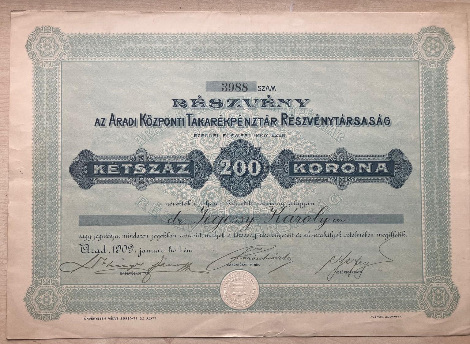 Aradi Központi Takarékpénztár Rt. (Arad Central Savings Bank Co.) share, issued January 1, 1909, for 200 Korona. Beautiful green-blue design with floral motifs and seal. Represents the cooperative financial system of the Austro-Hungarian Empire. Printed by Posner, Budapest. Scarce and elegant early 20th-century financial document.