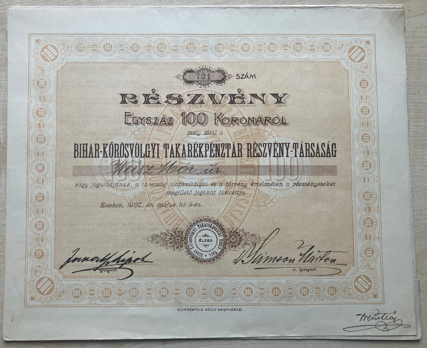 Issued May 9, 1907, by Bihar-Körösvölgyi Takarékpénztár Rt., Élesd (Aleşd), for 100 Korona. Printed by Sonnenfeld Adolf, Nagyvárad, with ornate orange-beige design and embossed seal. An elegant prewar Hungarian share certificate from the banking history of Transylvania.