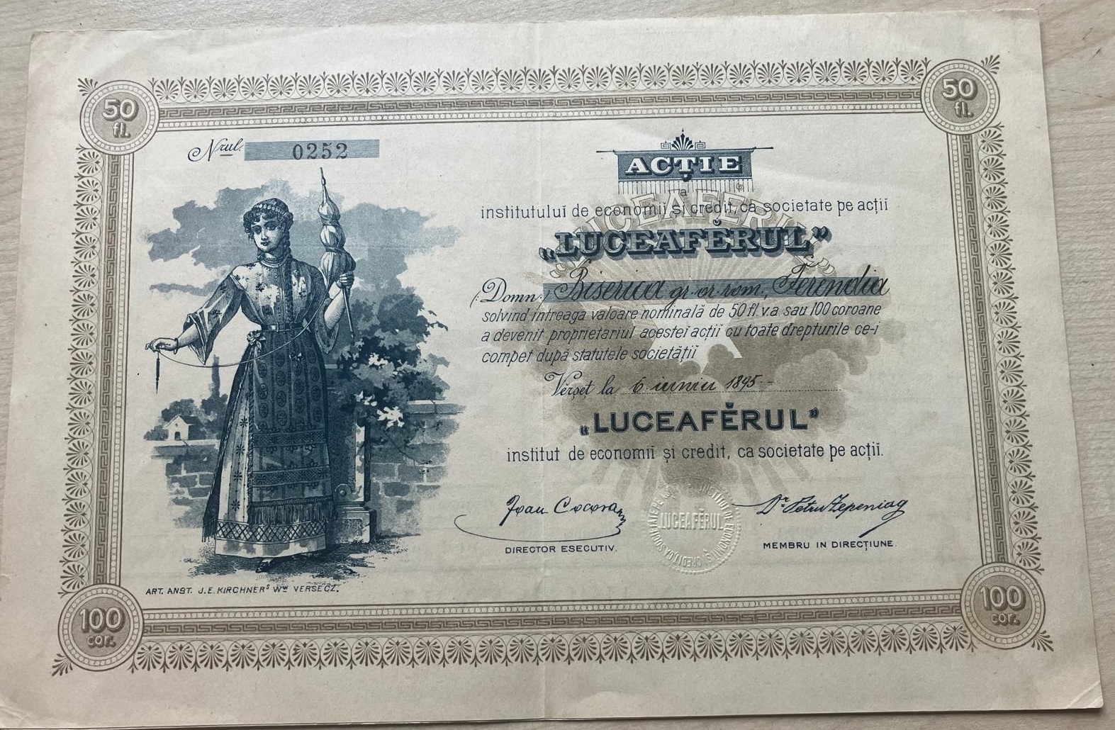 Early issue of the ‘Luceafărul’ savings and credit institute of Vršac, dated 1915. Denominated in florins and crowns, showing the pre-WWI Austro-Hungarian financial structure. Features same female figure motif. A transitional design before the Kingdom of Serbs, Croats, and Slovenes era.