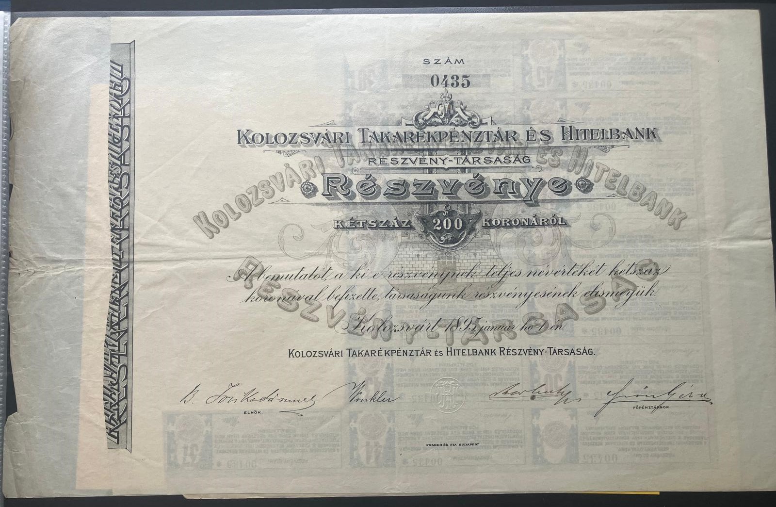 Large-format share from the Kolozsvári Takarékpénztár és Hitelbank Rt. (Cluj Savings and Credit Bank), issued in 1893 for 200 Korona. Elegant black engraving with gothic-style typography. One of the earliest bank shares from Cluj, then part of the Austro-Hungarian Empire. Signed by notable Transylvanian financiers.